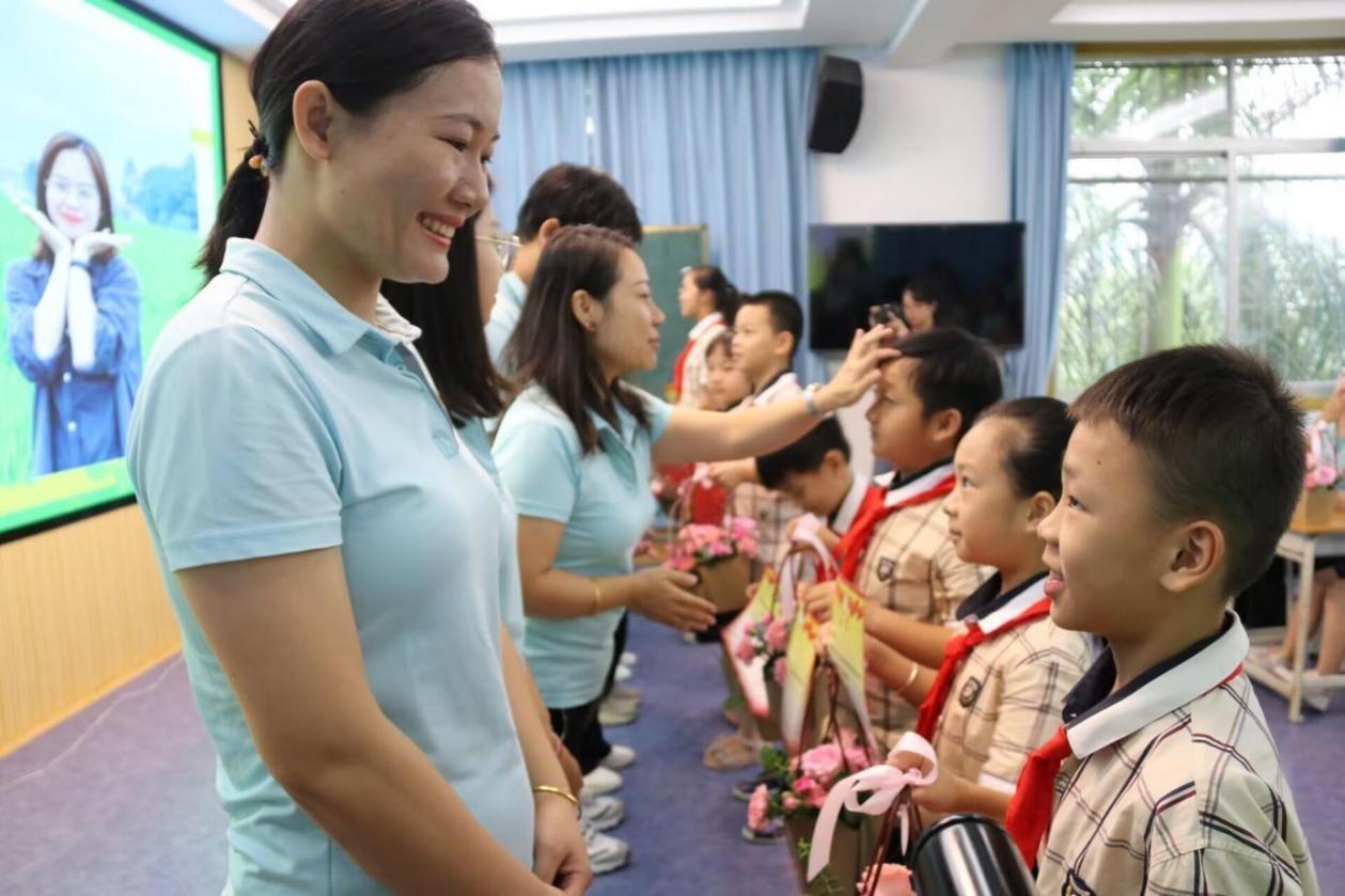 2023年教師節(jié)前,廣西南寧一所學(xué)校,學(xué)生向老師獻上鮮花、賀卡。