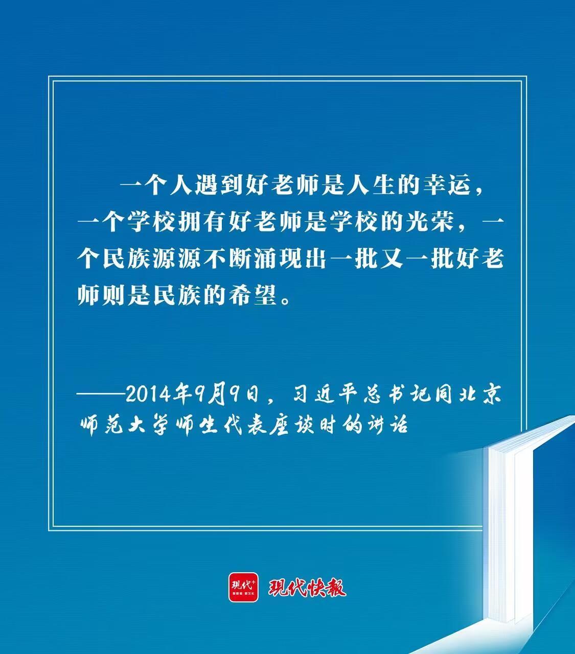 “一個人遇到好老師是人生的幸運,一個學校擁有好老師是學校的光榮,一個民族源源不斷涌現出一批又一批好老師則是民族的希望。”2014年教師節前夕,同北京師范大學師生代表座談時,習近平總書記的殷殷期盼,激勵廣大教師為民族復興拼搏奮斗。