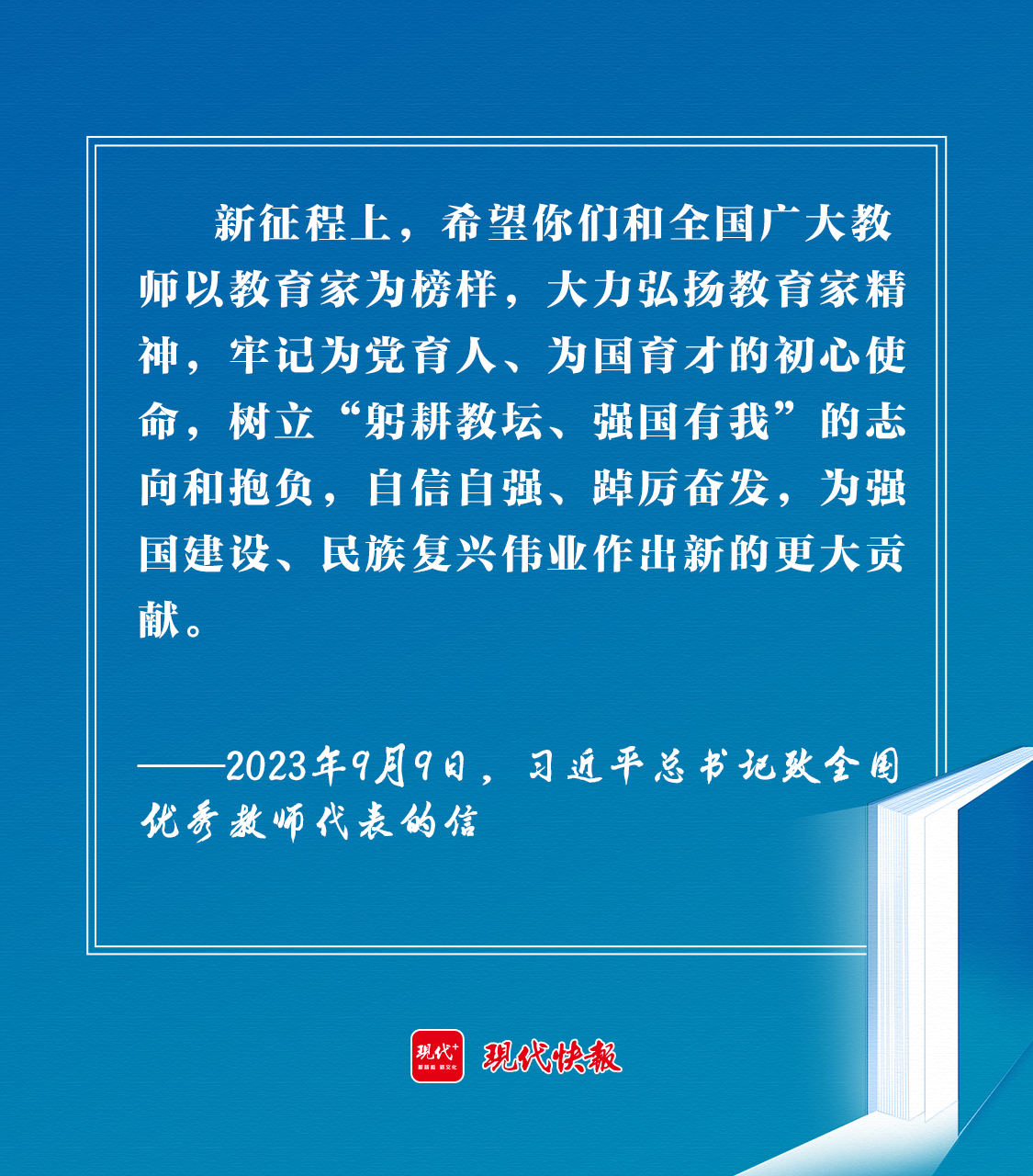 2023年9月9日,習近平總書記在致全國優秀教師代表的信中強調:“新征程上,希望你們和全國廣大教師以教育家為榜樣,大力弘揚教育家精神,牢記為黨育人、為國育才的初心使命,樹立‘躬耕教壇、強國有我’的志向和抱負,自信自強、踔厲奮發,為強國建設、民族復興偉業作出新的更大貢獻。”