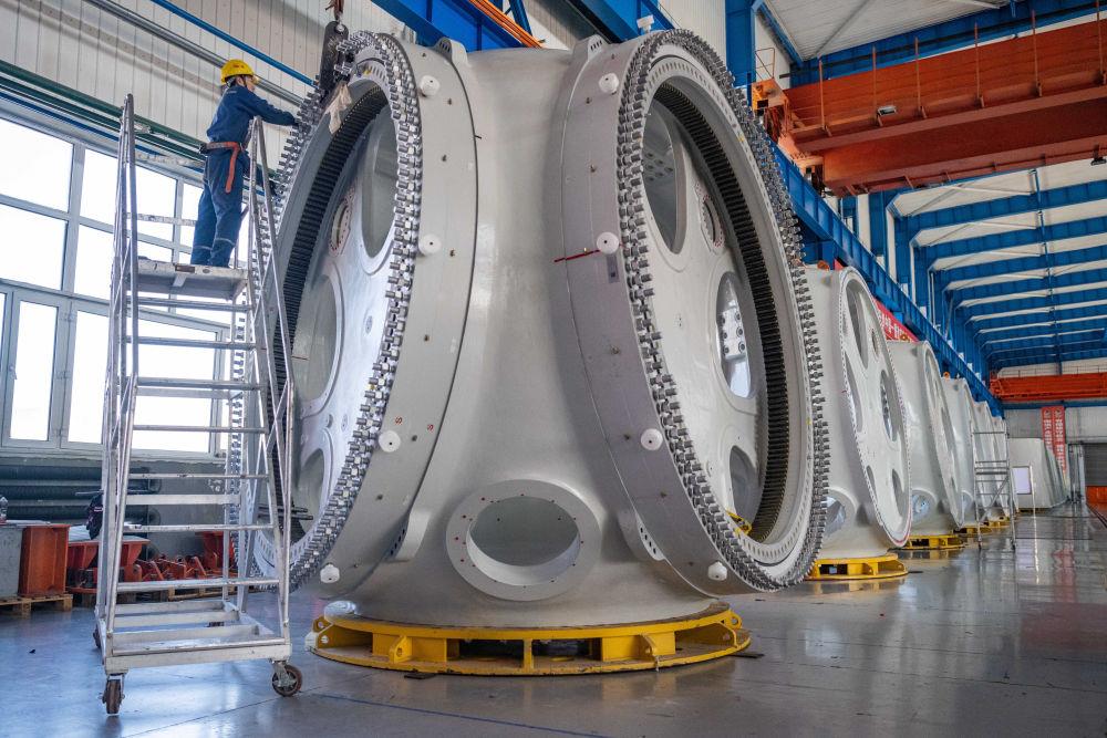 2024年4月28日,工作人員在中國一重集團有限公司的風電設備裝配車間內加工風電輪轂。