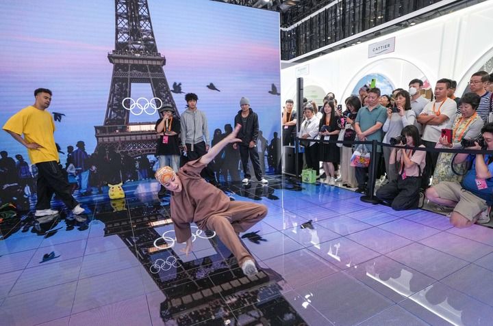2024年9月14日,在2024年服貿會國家會議中心綜合展區的主賓國法國展臺,中法兩國街舞好手在表演霹靂舞。