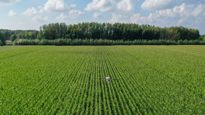 2024年8月8日,在吉林省梨樹縣孤家子鎮,無人機為作物施肥(無人機照片)。新華社記者 張楠 攝