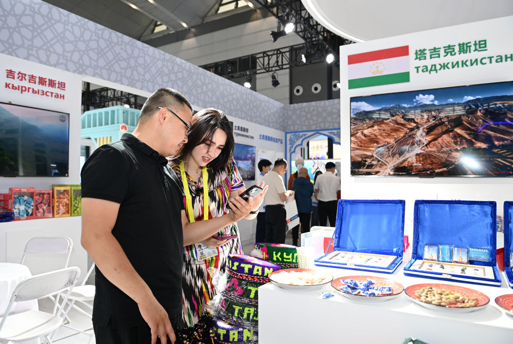 2025年5月21日,在第九屆絲綢之路國際博覽會暨中國東西部合作與投資貿易洽談會絲路優品展上,參觀者了解塔吉克斯坦商品。新華社記者 李一博 攝