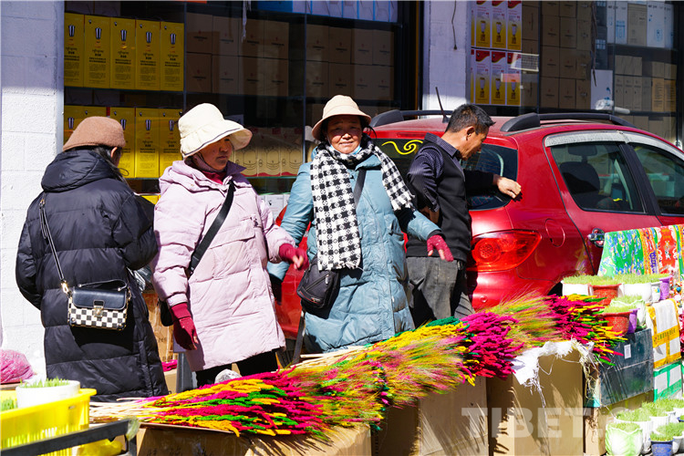 圖為正在銷售青稞苗和“洛薩美朵”的藏族阿佳 攝影:趙振宇