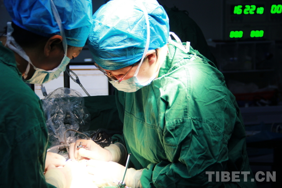 圖為航空總醫院婦科主任余立群(右二)在手術中指導甘孜縣人民醫院醫生操作手術 攝影:劉莉