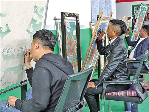 囊謙縣乃嘉瑪唐卡文化藝術(shù)有限公司里,在非遺傳承大師桑買的指導(dǎo)下,一批年輕的農(nóng)牧民唐卡繪畫藝人在成長,同時也拓寬了他們增收致富的渠道。申維祖 攝