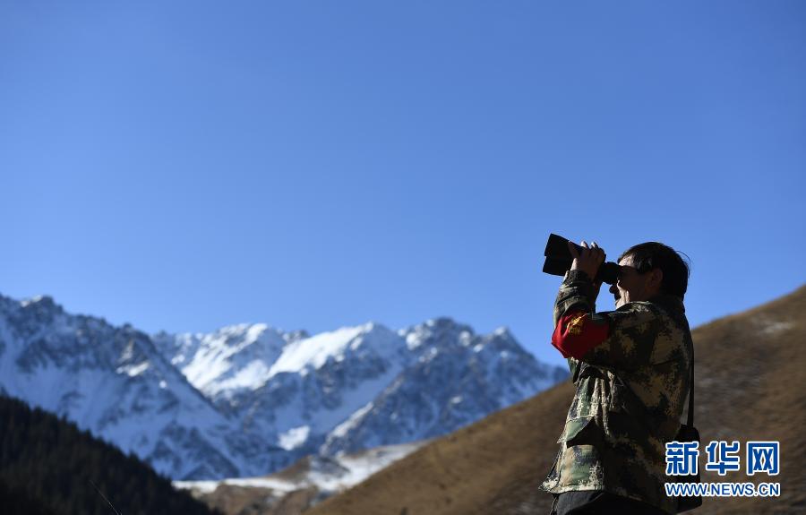 12月8日,祁連山國家公園扎麻什管護站生態管護員周曲才郎巡查途中使用望遠鏡。新華社記者 張宏祥 攝