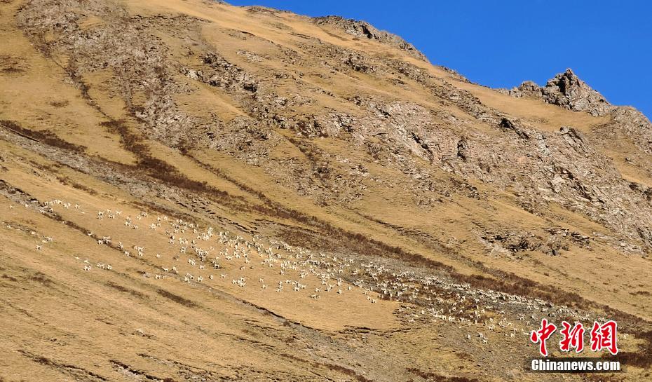 位于青海省南部的三江源區域,包括長江源(可可西里)、黃河源、瀾滄江源,是青藏高原生態系統的典型代表,分布雪豹、藏羚羊、野牦牛、黑頸鶴等珍稀物種,被稱“高原野生動物王國”、“高寒生物種質資源庫”。圖為巖羊群。曲麻萊管理處 供圖