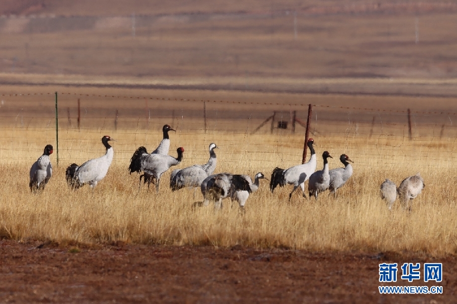 圖為黑頸鶴翔集于青海嘉塘草原上。青海省玉樹藏族自治州稱多縣委宣傳部供圖