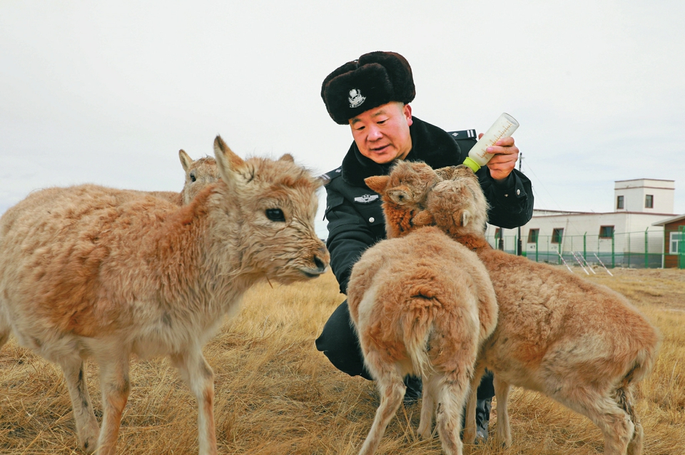 索南達杰保護站站長趙新錄在給藏羚羊幼仔喂奶。新華社發