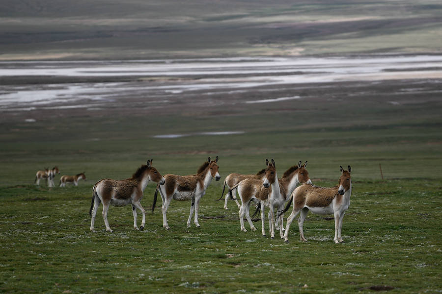 在三江源地區,一群藏野驢在草原上活動(7月25日攝)。新華社記者 張龍 攝