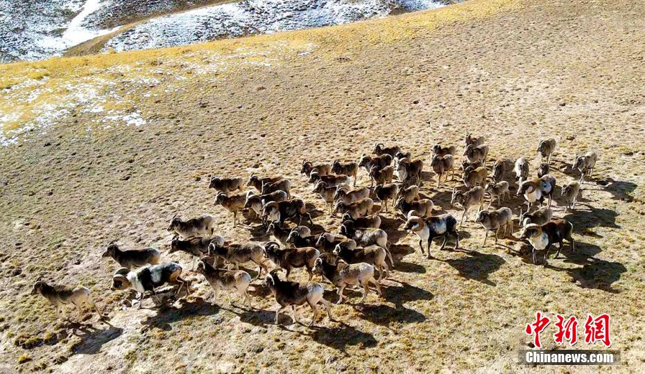 圖為航拍成群盤羊奔跑。贊慶 攝
