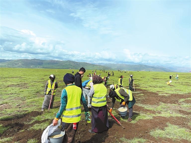“瑪曲縣地處青藏高原,由于海拔高、氣候寒冷、植物生長期短、自然條件嚴酷等原因,可借鑒的沙化治理技術(shù)措施少,導致沙化治理難度大?!爆斍h草原工作站站長楊林平告訴記者,經(jīng)過多年的試驗、示范和總結(jié),瑪曲縣探索出了一套適合當?shù)氐摹罢?植灌+草方格+施肥+土質(zhì)改良+人工種草+圍欄”的沙丘治理技術(shù)模式,目前對已形成的沙化土地和黑土灘退化草地等進行重點治理,成效顯著。