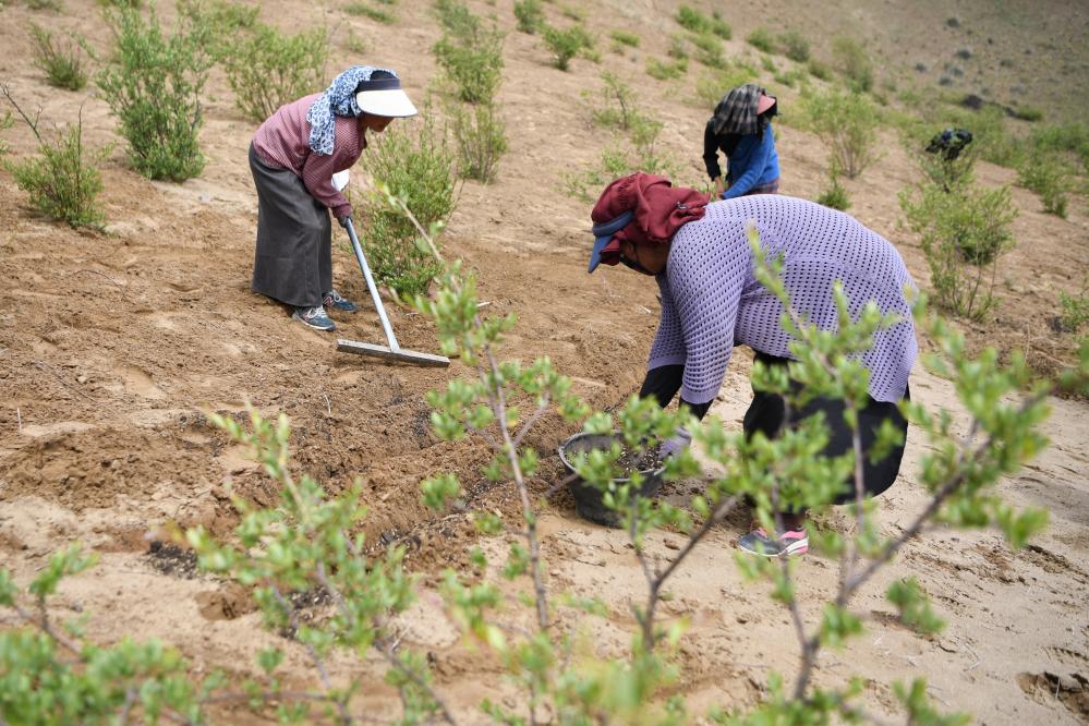 牧民在瑪曲縣歐拉鎮黃河沿岸一處沙化草原治理點補種草籽(7月6日攝)。新華社記者 方欣 攝