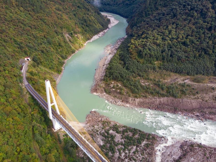 川藏公路通麥路段上的迫龍溝特大橋(2019年10月27日攝,無人機照片)。新華社記者 孫非 攝