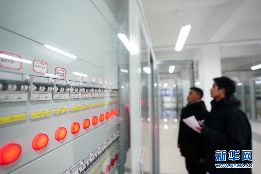 在西藏阿里與藏中電網聯網工程薩嘎220千伏變電站,工作人員查看設備運行情況(2020年11月27日攝)。新華社記者 詹彥 攝