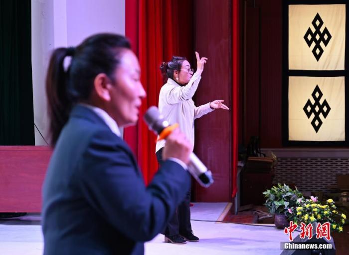 圖為3月11日,拉薩市人民檢察院未成年檢察廳負責(zé)人普布倉覺在做法治宣講,拉薩市特殊教育學(xué)校的手語老師為聾啞學(xué)生翻譯。 中新社記者 趙朗 攝