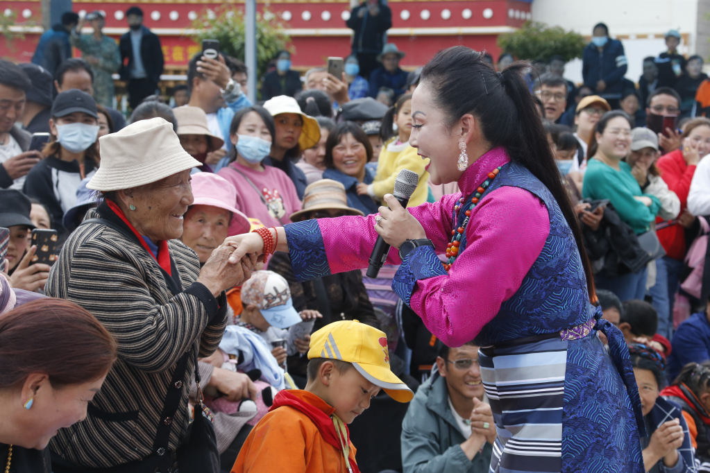在下鄉(xiāng)途中,德西美朵不僅給群眾演唱,而且還積極向當(dāng)?shù)乩习傩諏W(xué)習(xí)民歌。她說(shuō):“我希望可以通過(guò)我的演繹讓更多人聽(tīng)到西藏群眾的聲音。”