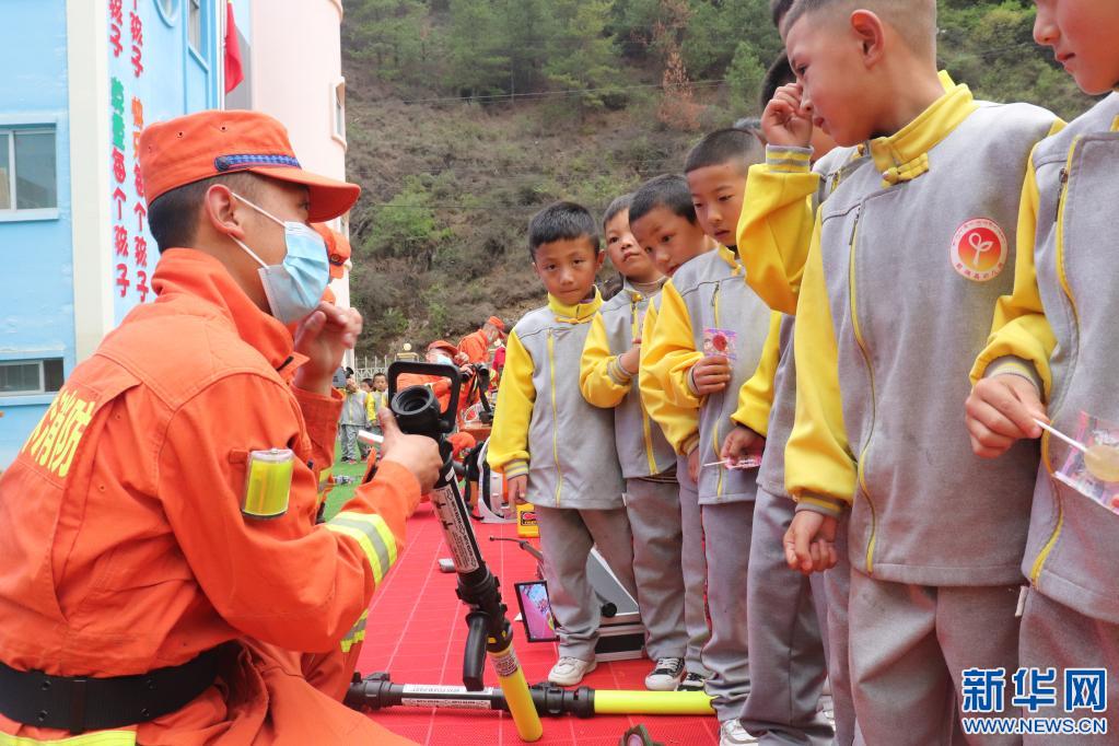 察隅縣森林消防員向學生介紹滅火裝備。張琳攝