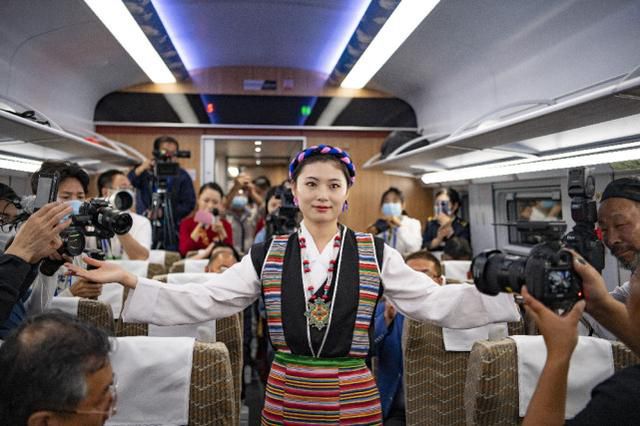 西藏首列復興號的列車員在進行當地服飾表演(6月25日攝)。 新華社記者 普布扎西 攝