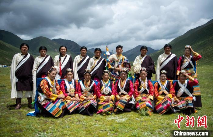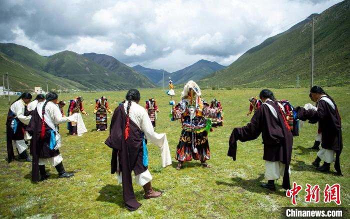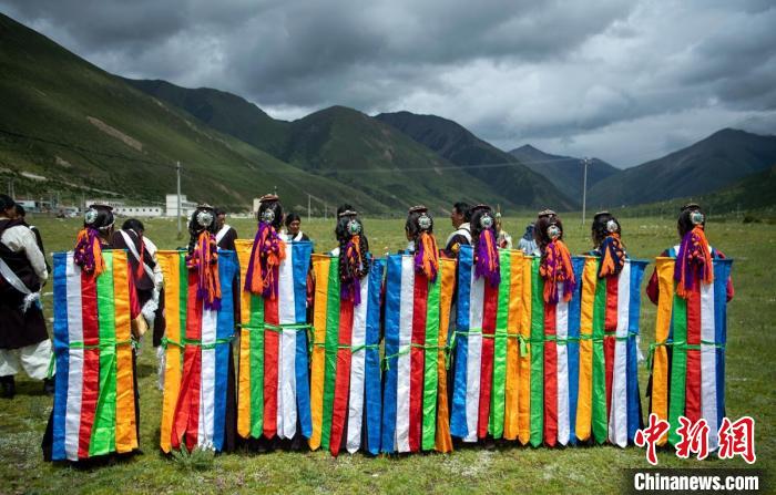 盛夏的西藏自治區拉薩市墨竹工卡縣門巴鄉仁多崗村草地上,28歲的尼瑪與身著盛裝的藏族牧民們跳著國家級非物質文化遺產直孔普堆巴宣舞,迎接遠道而來的游客,動作優美的歌舞吸引了大家駐足觀賞,并用手機或相機記錄。