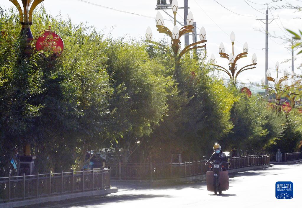 西藏阿里獅泉河鎮道路旁邊綠樹成蔭(9月19日攝)。新華社發 (索朗羅布 攝)