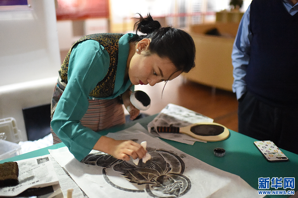 9月29日,在西藏大學新校區圖書館,日喀則石刻藝術博物館專業傳拓員德吉白珍演示拓片制作過程。新華網 旦增努布 攝