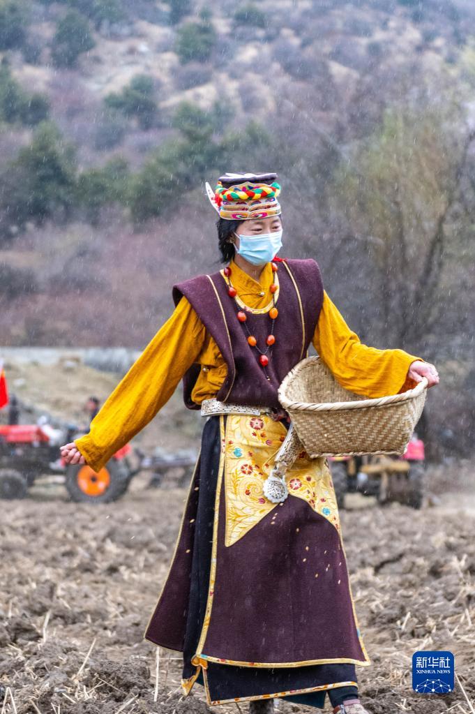 只見仁增旺姆手里端著裝滿青稞的竹筐,向田間撒下希望的種子。春耕隊(duì)伍跟隨在她的身后,肥沃的土地被犁出一道道深深的壟溝。