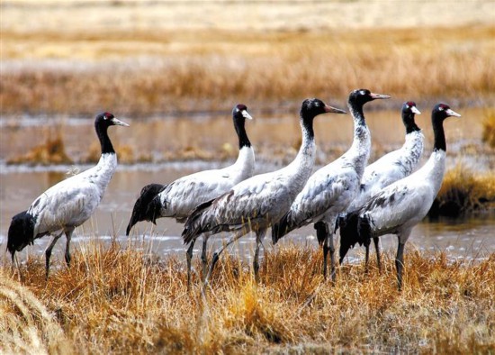 林周縣卡孜水庫附近覓食的黑頸鶴。