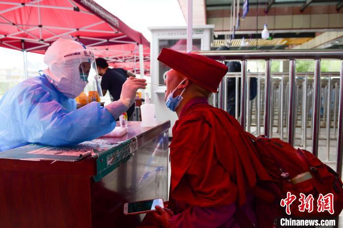 圖為8月11日,一位僧人在火車站出口處做核酸。 貢嘎來松 攝