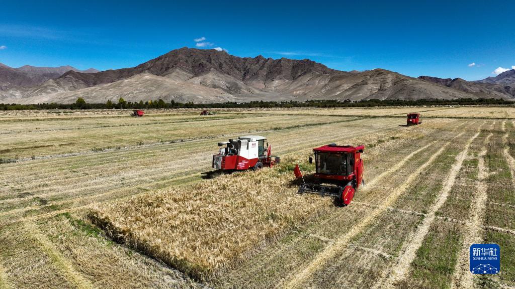 西藏日喀則市江孜縣熱索鄉努康村農機合作社的村民集中對村里三千多畝耕地進行機械化收割(9月19日攝)。新華社記者 晉美多吉 攝