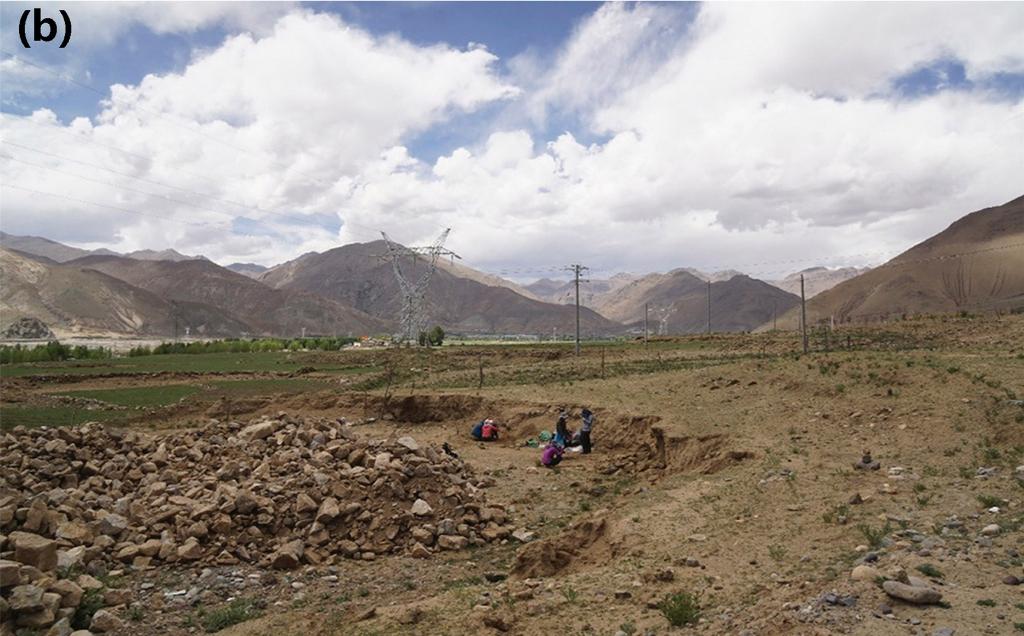 圖(b)為科考隊員發現共塘遺址后隨即進行地層剖面清理和樣品采集。(資料圖片由第二次青藏科考隊“人類活動歷史及其影響”分隊提供)