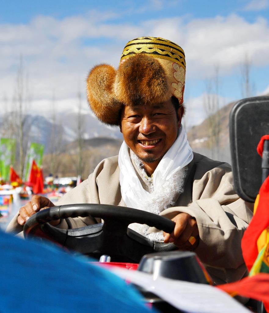 56歲的扎西次仁頭戴圓筒帽,身穿白色氆氌,腳蹬黑色靴子,開著五彩哈達和鮮花裝束的拖拉機來到開耕現場。“對農民來說,春耕秋收是一年中最重要的事情,每個人都要盛裝打扮出席。”他說。