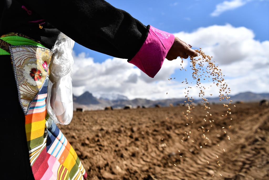 在西藏林周縣強嘎村的春耕儀式上,身著盛裝的村民在拋灑青稞種子(3月16日攝)。新華社記者 晉美多吉 攝