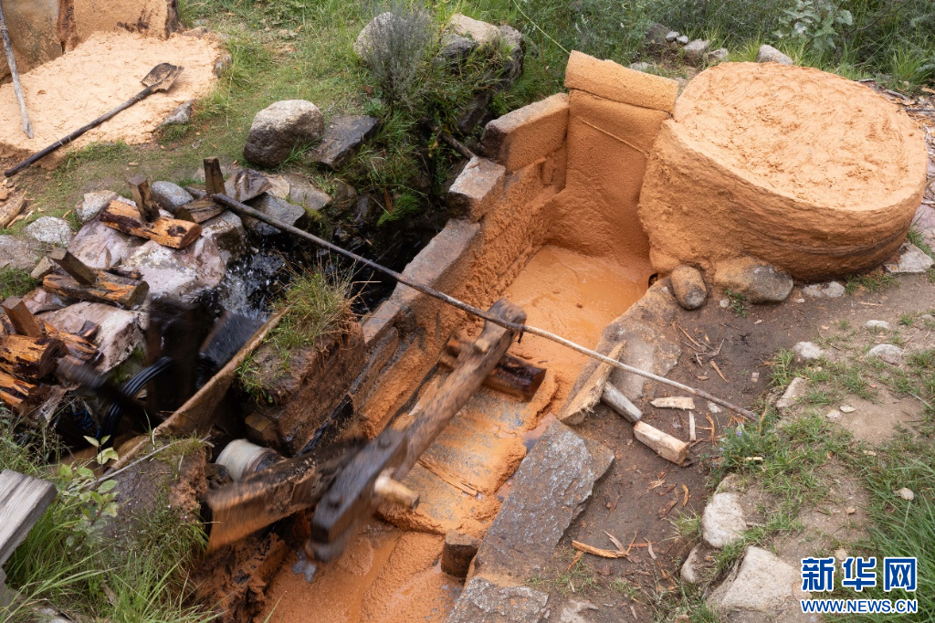 圖為水磨不斷研磨柏木使其成漿(8月21日攝)。新華網發 李騰 攝